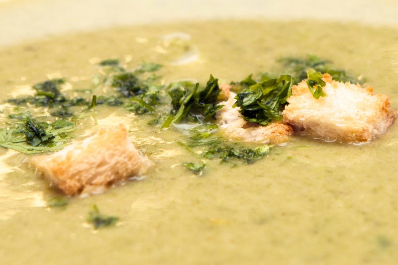 De halve krop in dunne reepjes snijden (dit heet: “chiffonade”) en kort smoren in de rest van de boter en roer door de soep. Snij casinobrood in blokjes van 1 cm en bak in olie bruin. (crouton) Kerveltakje en crouton bij opdienen van soep in de borden doen.