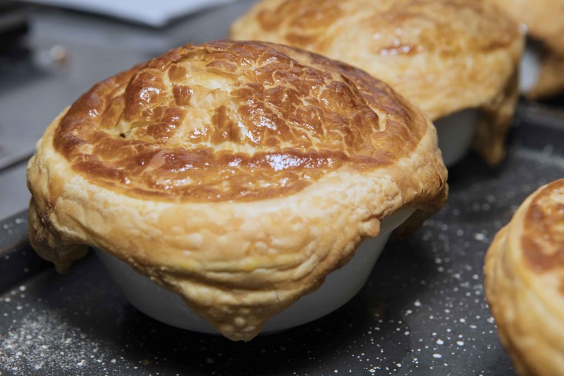 Snij de lever in plakjes van 12 mm en dan in blokjes. Verdeel het over de kommen. Voeg op dezelfde manier de plakjes truffel toe. Bedek met de bouillon en stop 2 cm onder de rand. Rol het bladerdeeg uit op het werkoppervlak. Knip vier cirkels met een diameter van 2-3 cm meer dan de diameter van de kom uit. Plaats cirkel bladerdeeg op elke kom. Draai de rand naar beneden over de rand, druk lichtjes om het te verzegelen. Meng de eigeel met een theelepel water en een snuifje zout. Borstel het over het deeg. Plaats in de oven en bak gedurende 20 minuten. Snijd aan tafel de kap van het deeg met een scherp mes.