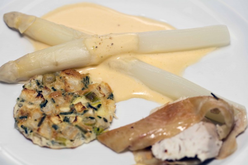 Verwarm in een pan met wat boter en water de asperges op laag vuur (+/- 20 minuten). Beetgaar.