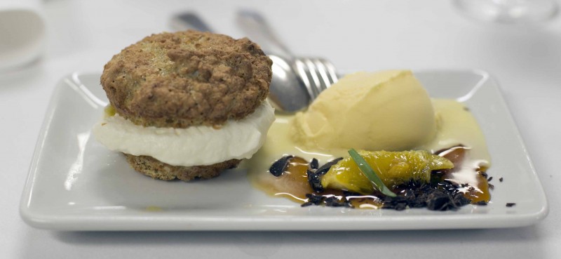 Leg een plak cake op een bordje. Garneer naar smaak en inzicht het bord met het ijs, extra sinaasappel, dragon, crue de cacao of chocoladeschaafsel en een flinke lik ahornsiroop