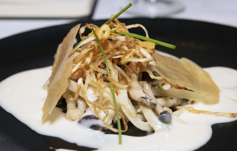 Schik de knolselderij-paddenstoelensalade op het midden van het bord. Lepel de smeuïge Taleggiocrème langs de salade. Werk af met de gefrituurde knolselderijreepjes, knoflookchips, de sprieten bieslook en de crispy pane carasau.