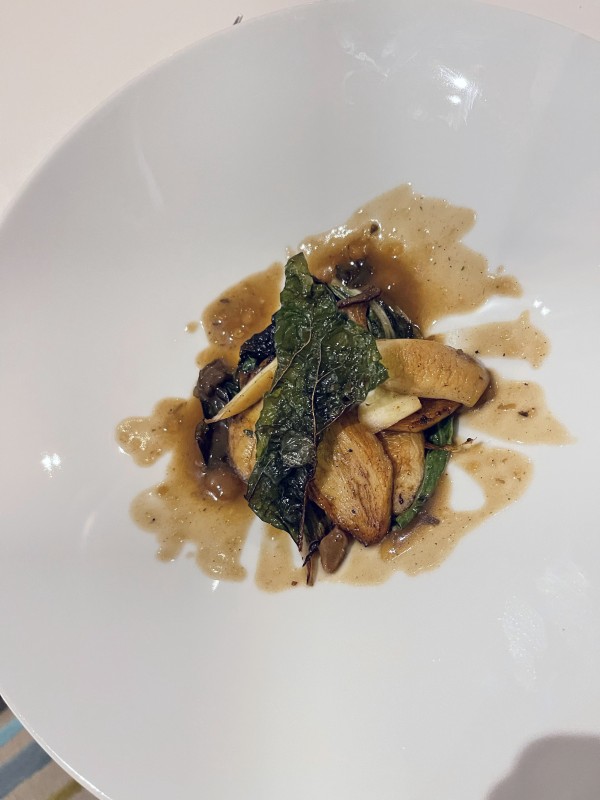VoorgerechtRoergebakken boleten/ koningszwammen met Romeinse sla of snijbiet