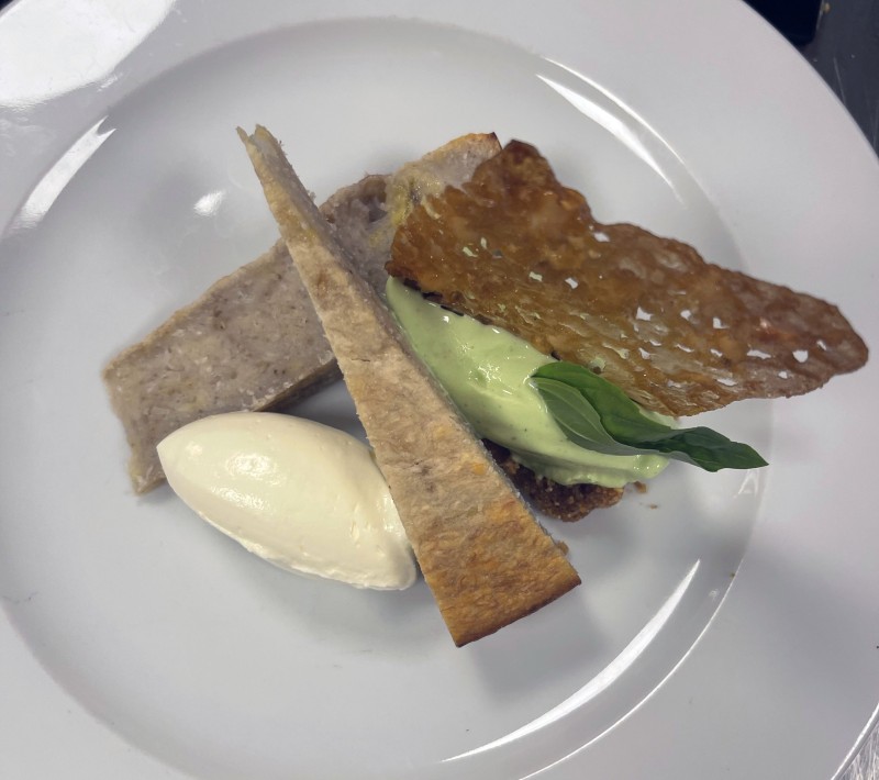 Zoek een mooi bordje en presenteer daar een stukje van de taart op. Naast de taart een beetje crunch om het bolletje basilicumijs op te presenteren.