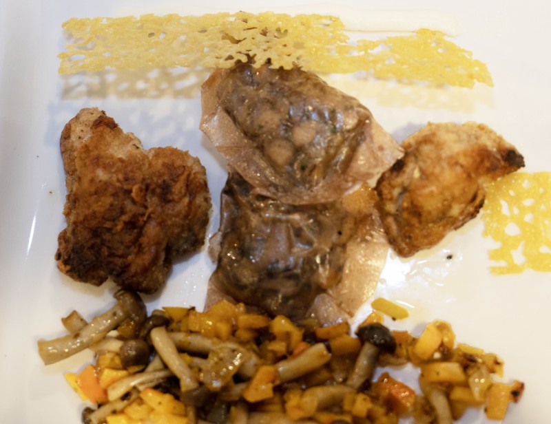 HoofdgerechtRavioli van Paddenstoelen, krokante zwezerik, schalie van Comté en wasabiroom
