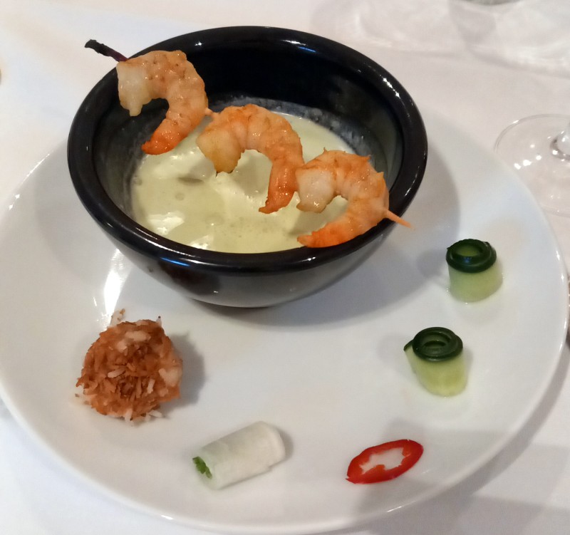 Saté van tijgergarnaal met koude kokossoep