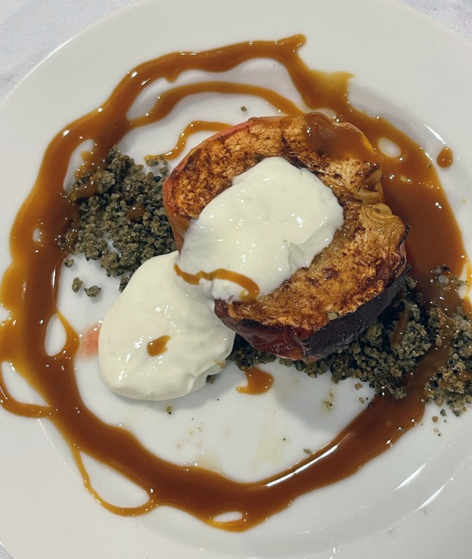 NagerechtWarme appel uit de oven, gemberkaramel, yoghurt, sesamcrumble
