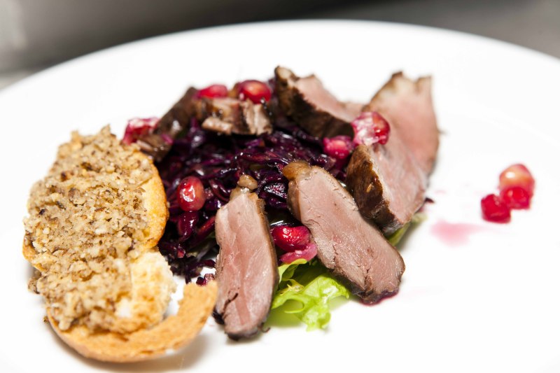 Leg op ieder bord een burger, schep hierop de paddenstoelen. Garneer met rucola. Schep de bietjes ernaast.